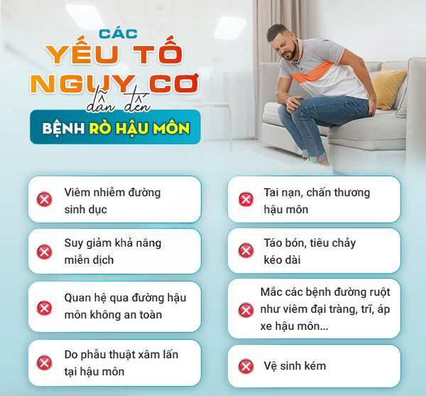 Chấn thương vùng hậu mônCác tổn thương do tai nạn, phẫu thuật hay quan hệ tình dục không an toàn…có thể làm rách mô hậu môn, tạo điều kiện cho vi khuẩn xâm nhập và hình thành ổ nhiễm trùng, dẫn đến bệnh rò hậu môn.